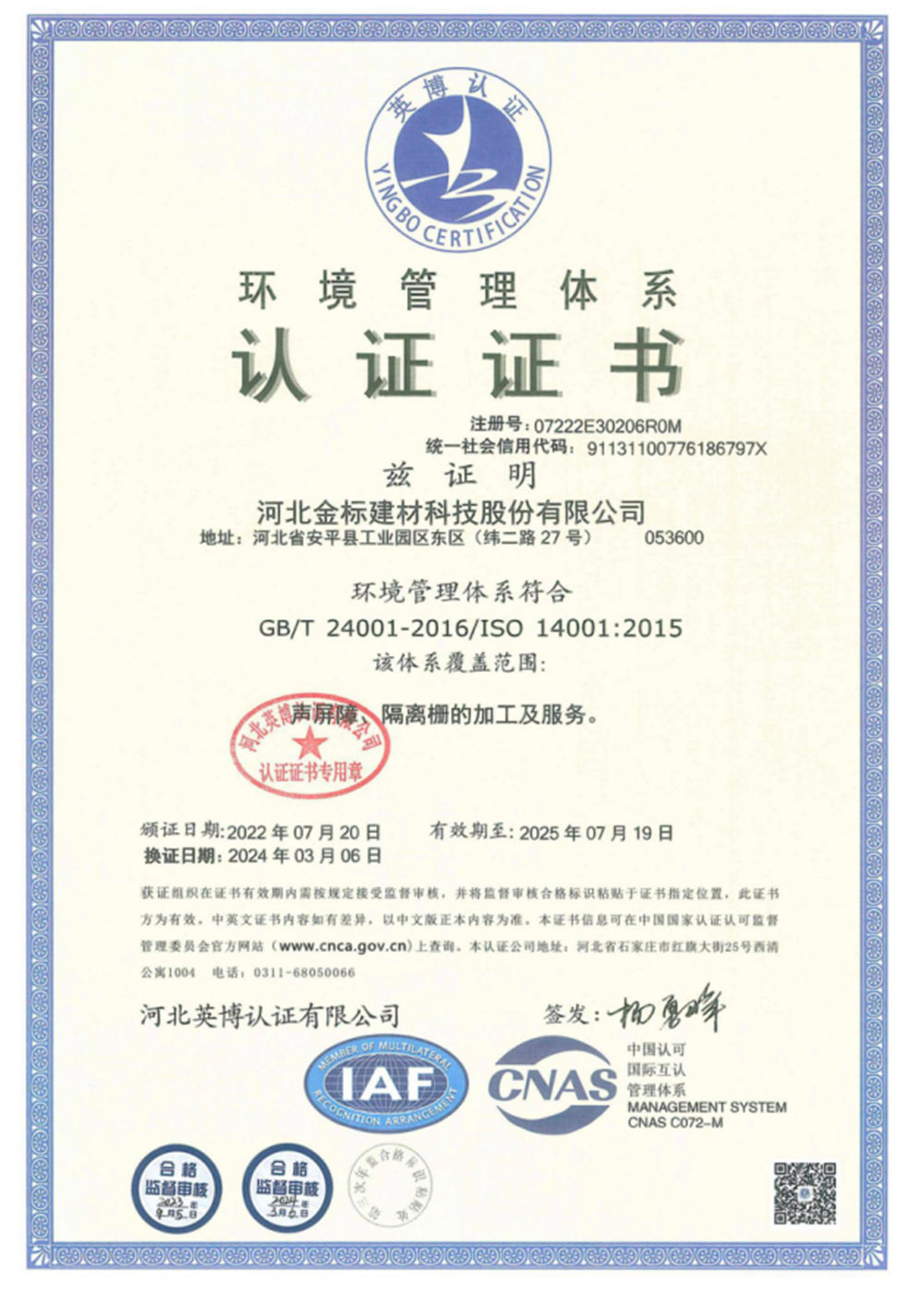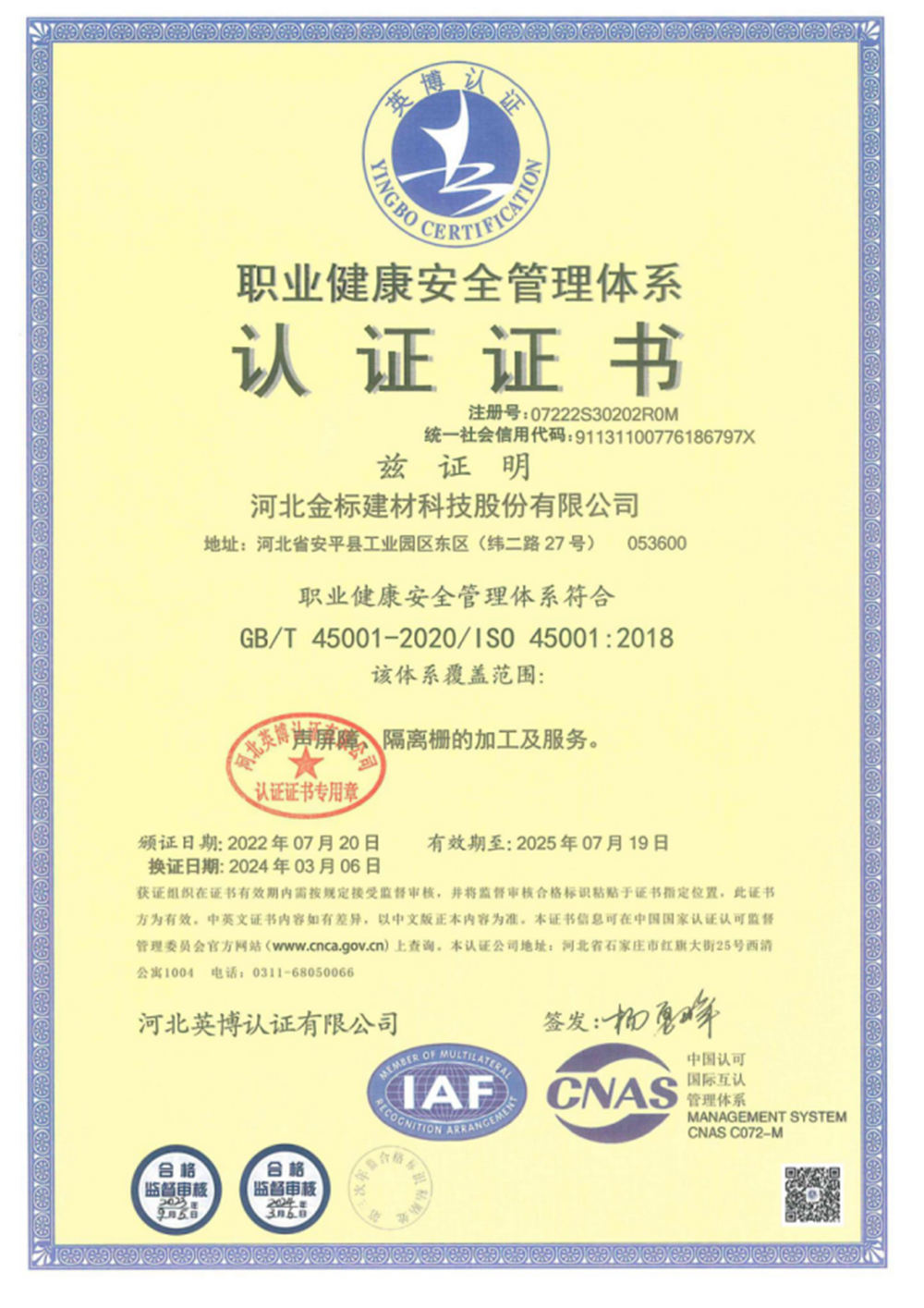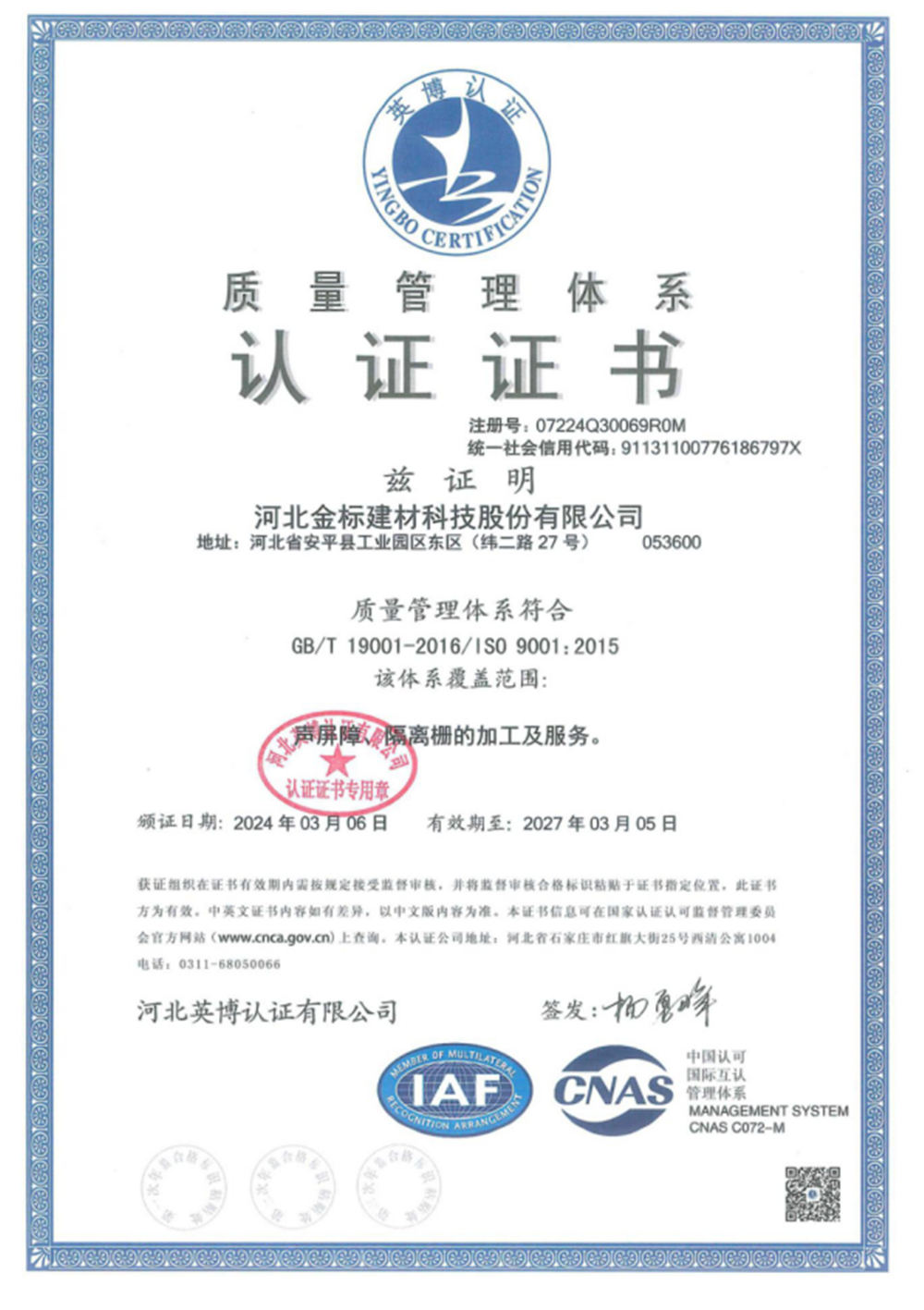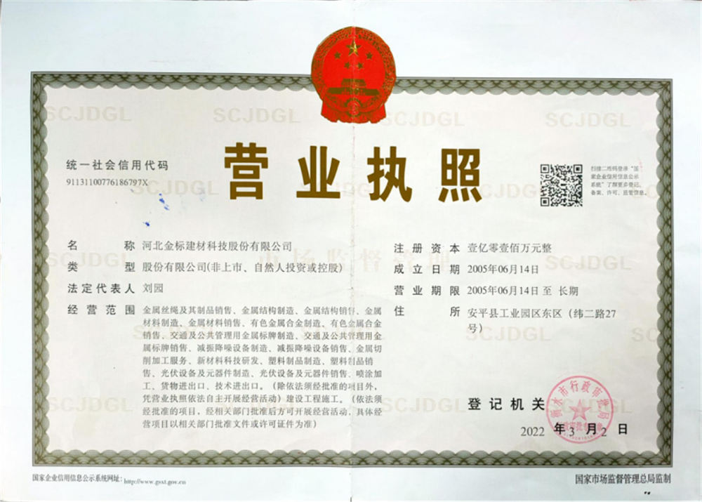 河北金標(biāo)建材科技股份有限公司成立于2005年,1998年開始建廠生產(chǎn),是一家國(guó)內(nèi)較早從事交安材料的專業(yè)生產(chǎn)廠家之一;公司占地200萬(wàn)畝,擁有員工400余名,注冊(cè)資金6040萬(wàn), 已通過(guò)ISO9001質(zhì)量管理體系認(rèn)證,具備產(chǎn)品批量生產(chǎn)合格證、多項(xiàng)檢測(cè)報(bào)告等,先后獲得“AAA級(jí)信用企業(yè)”、河北優(yōu)秀企業(yè)”等殊榮。公司業(yè)務(wù)經(jīng)營(yíng)范圍包括高速公路、鐵路聲屏障生產(chǎn)基地;隔離柵,防護(hù)柵欄、刺鐵絲生產(chǎn)基地。